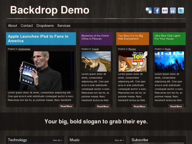 Backdrop a blog magazine style theme with colour coded categories designed for sites using lots of images.