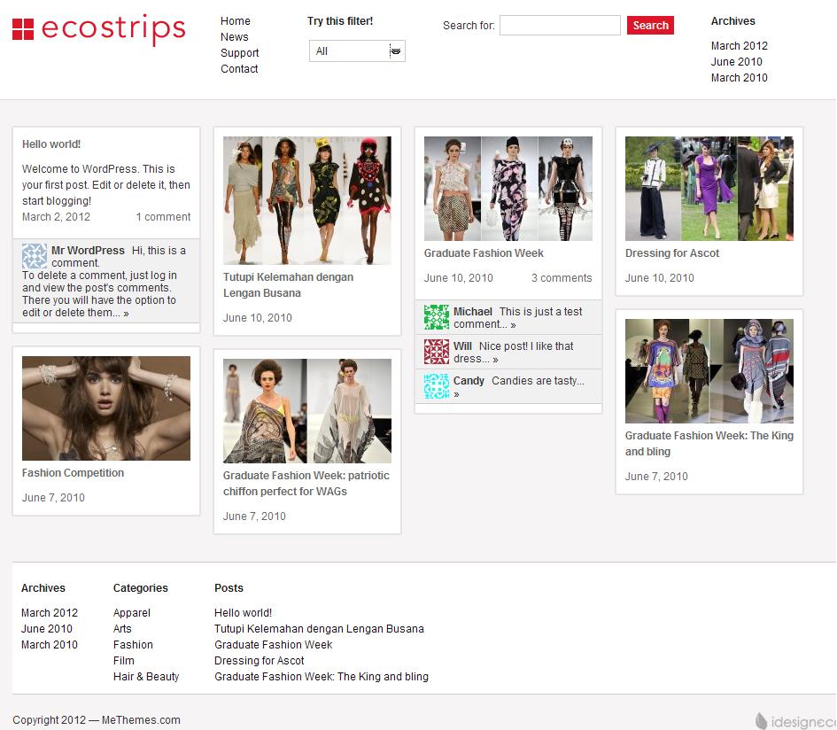 EcoStrips is a premium WordPress theme with a dynamic post wall mashup design inspired by Pinterest. The theme has a dynamic mobile responsive layout, with the wall reorganizing itself based on the users screen size. Other features include a dynamic content filter to filter the wall of posts by categories, inbuilt image resizing, custom widgets, theme options panel and more.