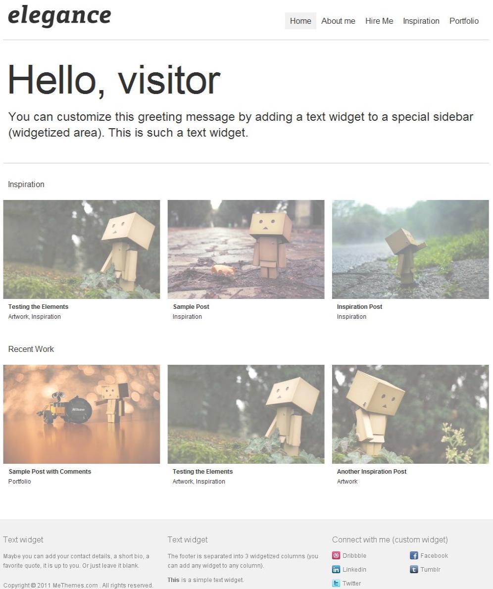 Elegance is a minimalist gallery / portfolio premium WordPress theme. The theme features a fully widgetized homepage, drop down menus, built in social connect widget, theme options page and more.