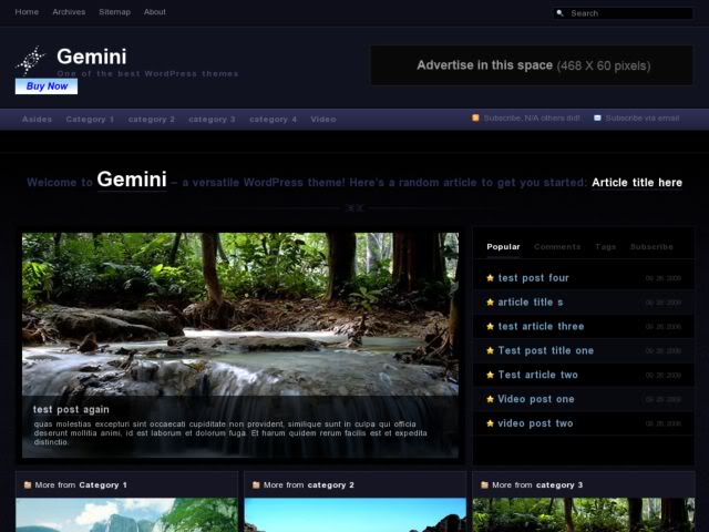 Gemini is busy, but simple, at the same time. Crammed into the homepage, we have links to over 25 of your articles, recent comments, links, tags, and even all of your categories. This obviously provides great coverage- all without cluttering the page. Everything has its own space, and has been scrupulously designed to be visually pleasing, as well as useful.