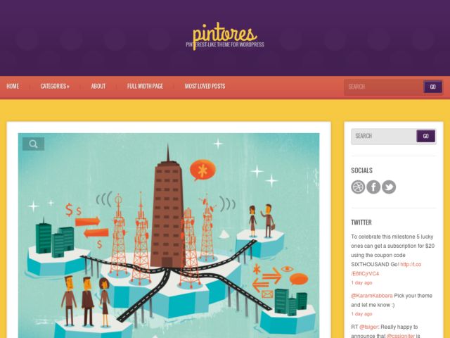 Pintores is a Pinterest inspired WordPress theme that allows you to blog in style and share all different types of media. The theme supports WordPress post formats allowing you to post music tracks, videos, images, photo galleries, quotes, links and of course normal blog posts. The professional design has 5 colourful and bold colour schemes to really make your site stand out and make people take notice and more importantly come back.