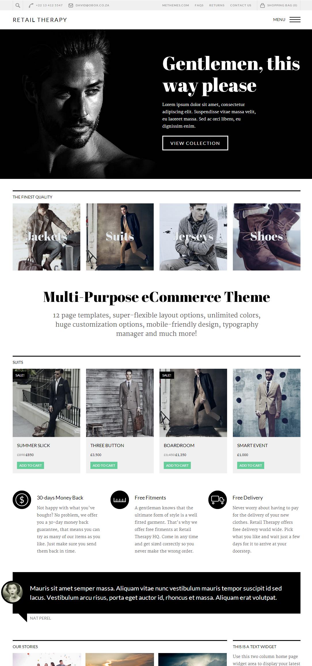 Retail Therapy is a powerful, flexible and super stylish multipurpose mobile ready WordPress theme that can be used for an ecommerce store, business website or portfolio. A huge amount of attention to detail has gone into this theme and it shows with pixel perfection.