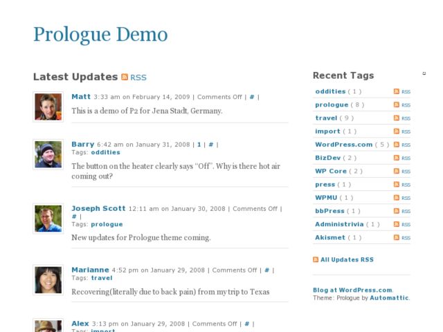 SiXX WordPress Microblog theme is a microblog theme with focus on the conversation. The aimed purpose with the theme is for companies and teams to get their internal communication going in a much more open, searchable and informal way. This theme is built on top of the Automattic Prologue theme, maybe it should be called an extension of the prologue theme.