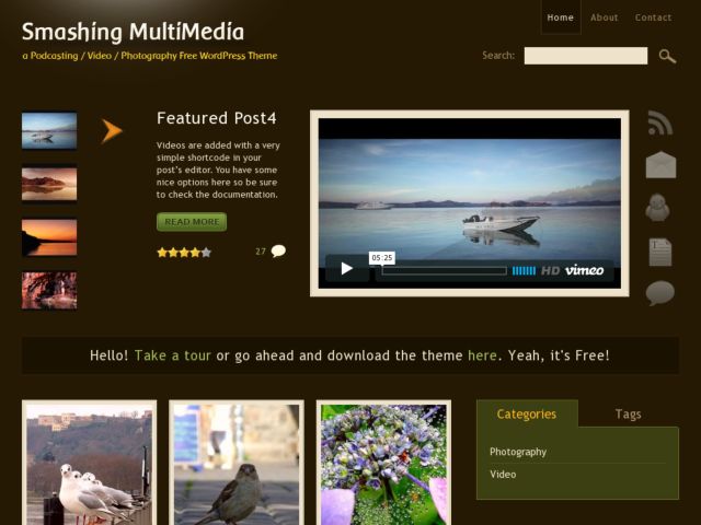 Smashing MultiMedia这是一款独特细致的免费WordPress主题,多媒体、摄影类的主题,主题有后台管理面板,以很简单的方式嵌入媒体,有8个可以放置小工具的位置,需要wp-Pagenavi, wp-PostRatings, WP125 included插件,非常漂亮,非常华丽,即使你不用这个主题也应该查看一下演示。